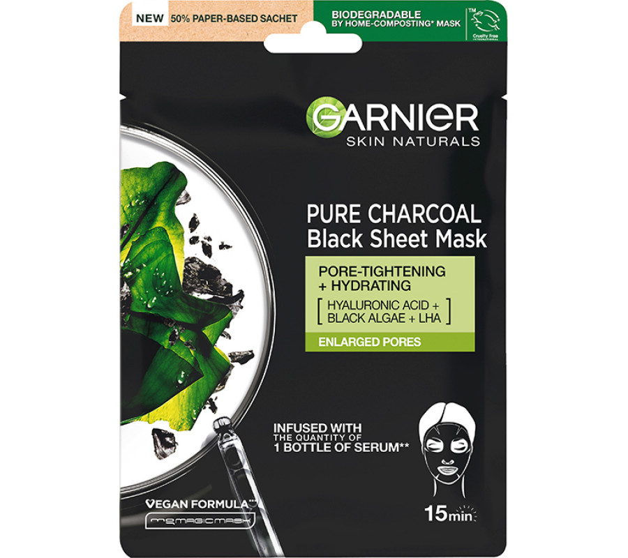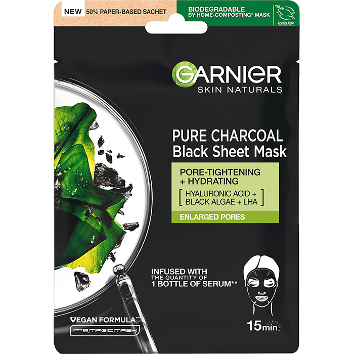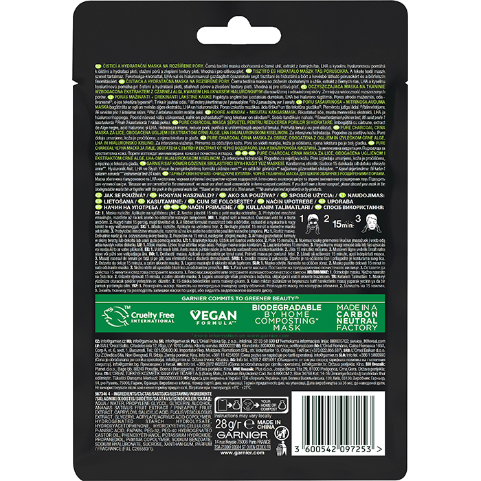Чорна тканинна маска "Очищувальне вугілля", для шкіри з розширеними порами Garnier, 28 г