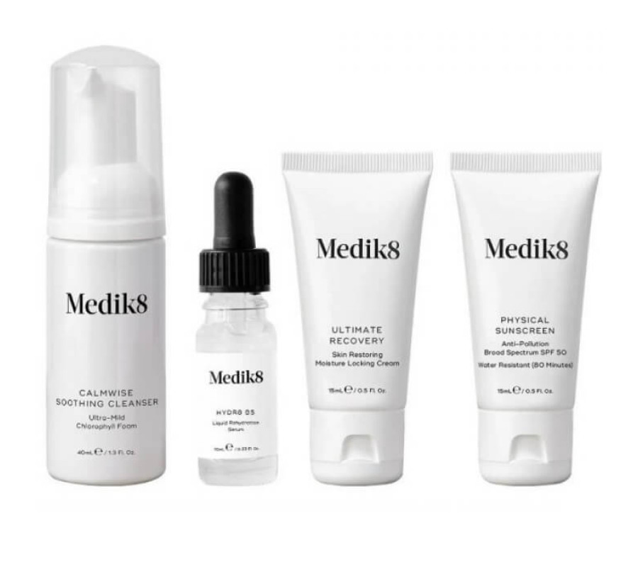 Состав набора: Очищающая пенка для чувствительной кожи - Medik8 Calmwise Soothing Cleanser, 40 мл + Увлажняющая сыворотка - Medik8 Hydr8 B5 Liquid Rehydration Serum, 10 мл + Солнцезащитный крем SPF30 - Medik8 Physical Sunscreen SPF30, 15 мл + Интенсивный крем для восстановления кожи - Medik8 Ultimate Recovery Intense Cream, 15 мл