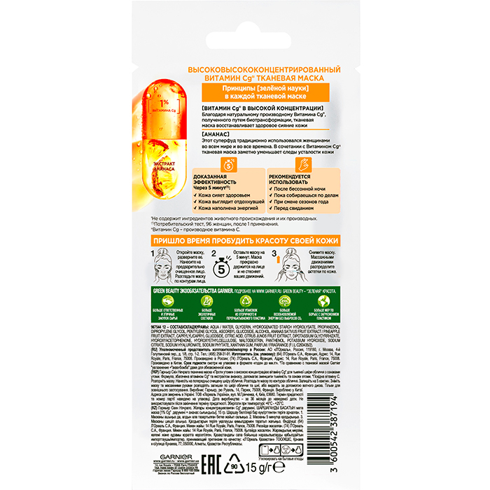 Тканевая маска "Против усталости" с высокой концентрацией витамина С Garnier, 15 г