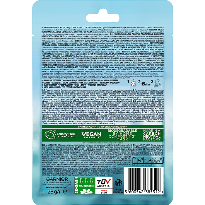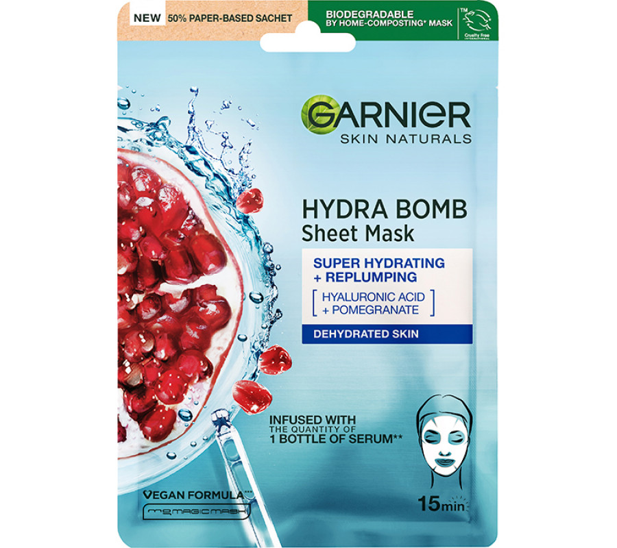 Тканинна маска для обличчя "Зволоження + АкваБомба" з гіалуроновою кислотою і екстрактом граната Garnier, 32 г